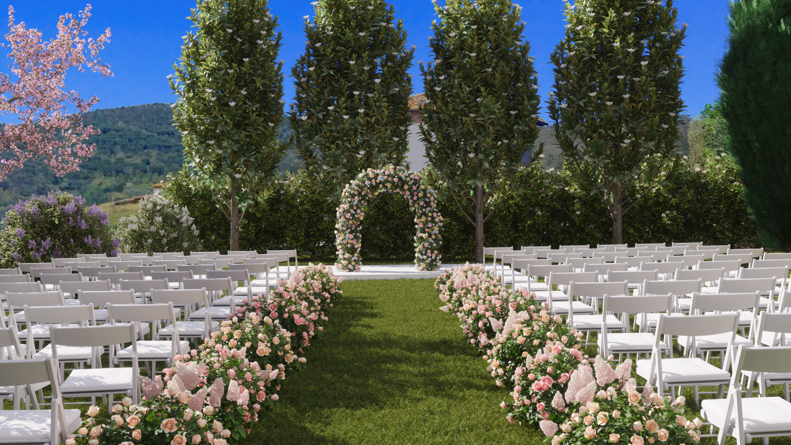 Floral arch frames a villa, perfect for private celebration villas in Italy.