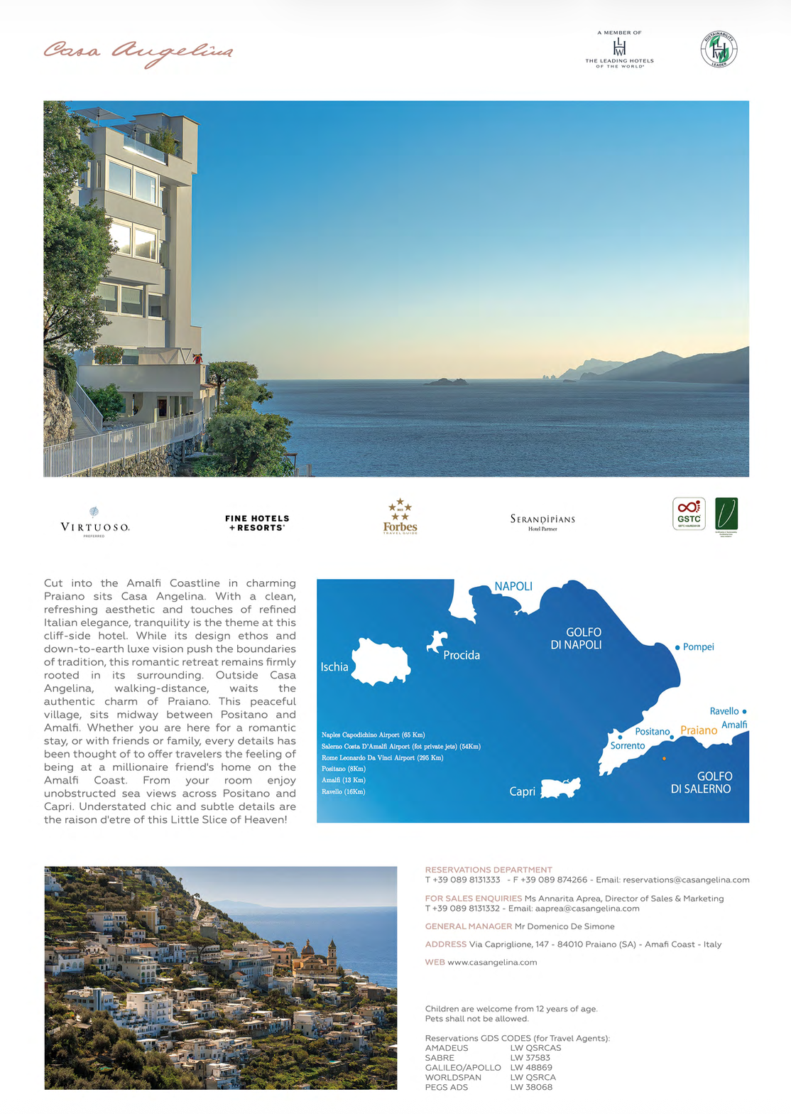 Casa Angelina is located in the heart of the Amalfi Coast, offering a complimentary shuttle service to and from Positano. As a proud member of the Leading Hotels of the World and a Virtuoso preferred partner, Casa Angelina promises an unforgettable experience. The hotel is an adults-oriented retreat; children are welcomed from 12 years and above, preserving an atmosphere of serenity and quiet sophistication, ideal for intimate and refined celebrations.